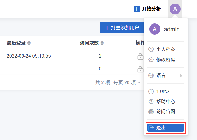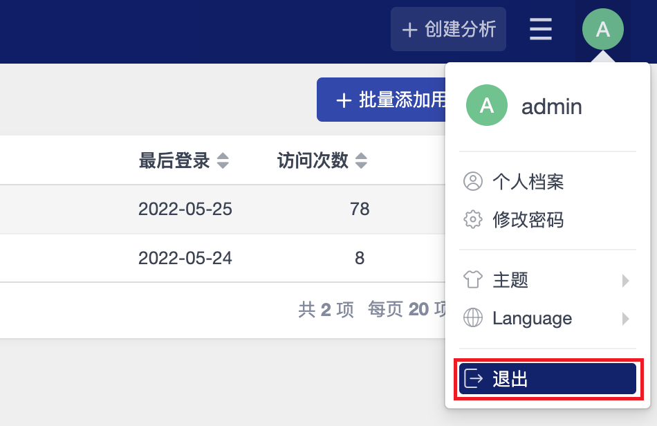 登入系统之后,会在页面顶部右侧显示当前登录的用户头像,鼠标悬停在头像时,显示用户功能菜单,点击“退出”菜单项即可退出系统。
