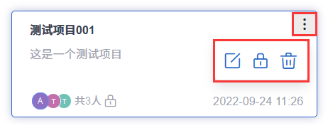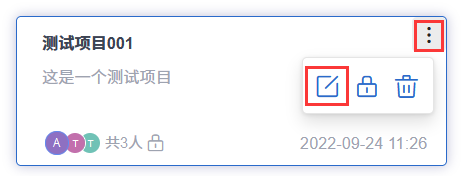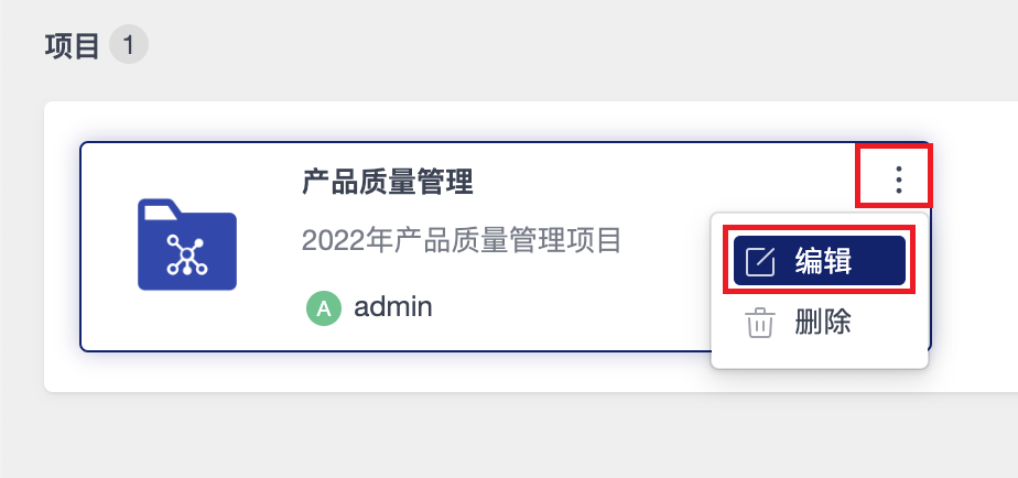 鼠标悬浮在项目卡片上,卡片右上角会显示“更多操作”按钮,鼠标继续悬停在更多操作按钮上,会显示更多操作菜单,点击菜单中的“编辑”菜单项,即可打开“项目编辑”对话框。