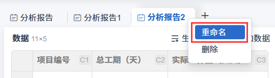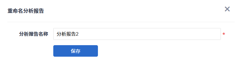 将鼠标悬停在分析报告名称上,右侧会显示更多操作按钮,鼠标继续悬停在更多操作按钮上时会显示“更多操作”菜单,点击菜单上的“重命名”菜单项即可打开重命名对话框,可对分析方案进行重命名操作。