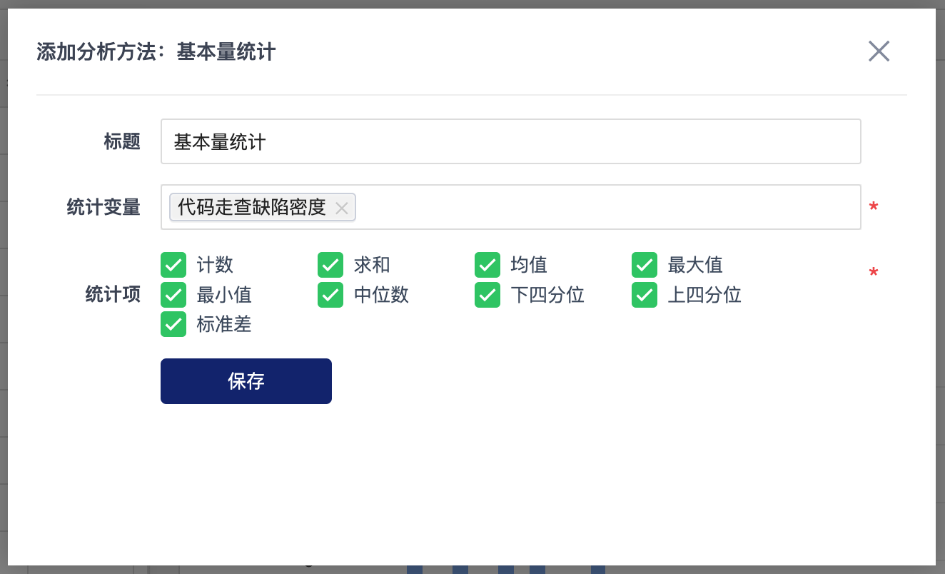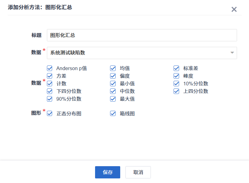 不同的分析方法在添加时需要填写不同的参数,可以为每个分析方法设置一个标题。根据提示设置好参数之后,点击保存按钮即可添加分析方法。