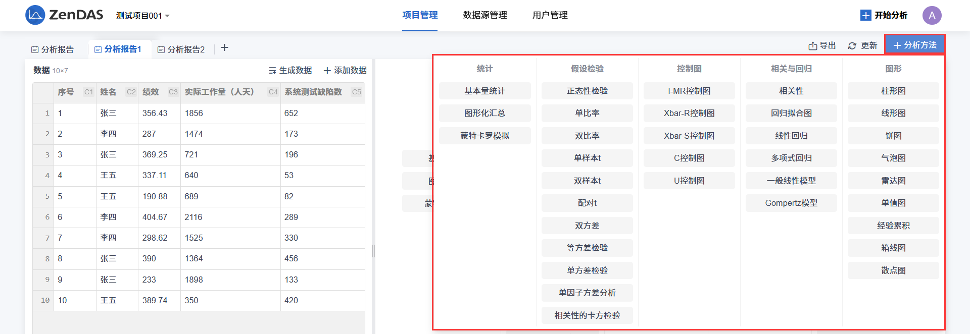 当还没有为分析报告添加分析方法时,分析报告页面右侧会显示分析方法快捷添加界面。点击一个分析方法按钮即可打开“分析方法添加”对话框进行添加。