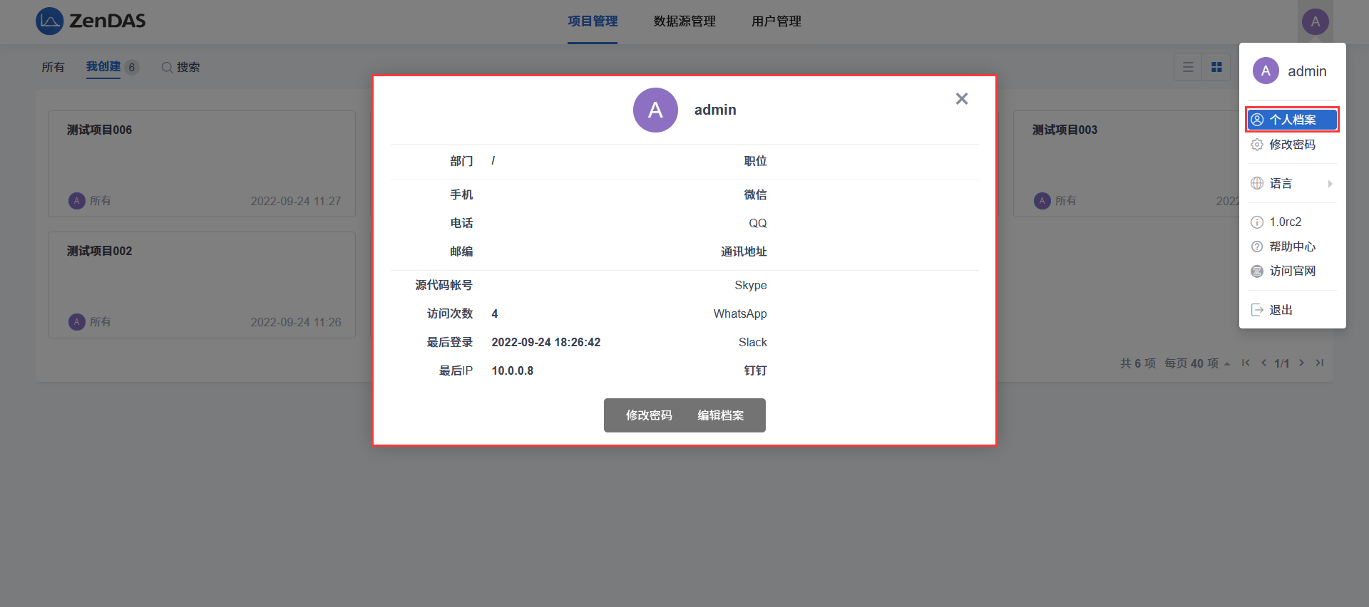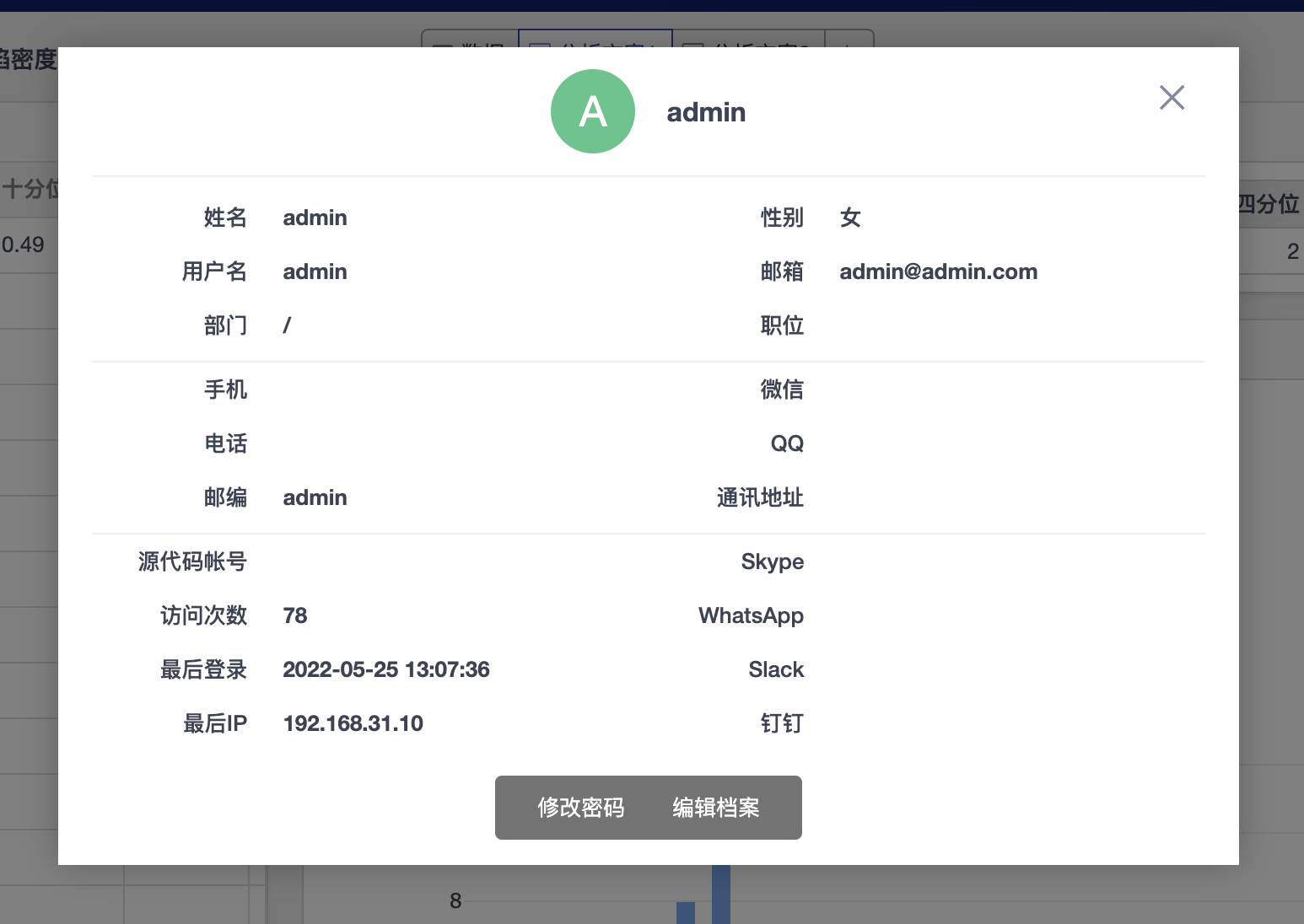 在个人信息档案对话框上可以查看个人信息,并可以通过对话框底部的操作按钮来修改密码或编辑档案信息。