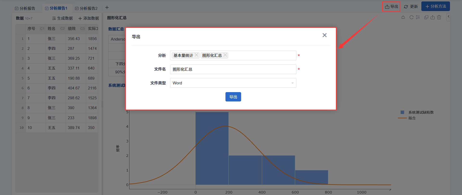 点击分析报告页面右上角的“导出”按钮,即可打开“导出”对话框进行导出。