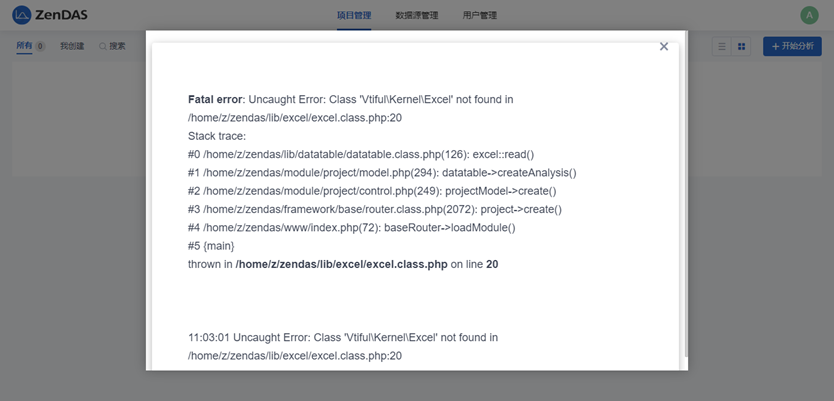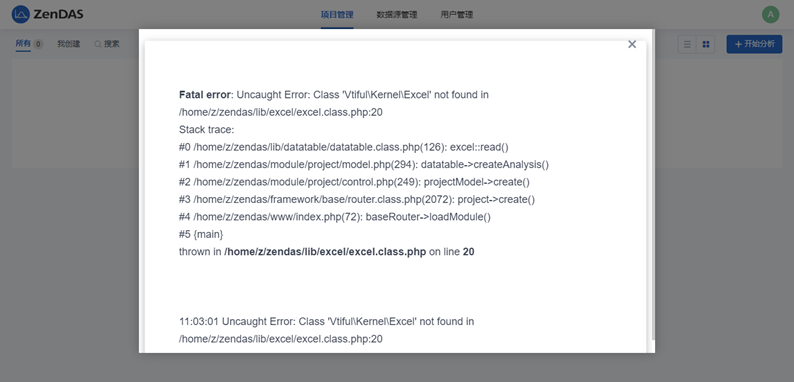 如果没有安装xlswriter扩展,访问ZenDAS软件站点上传xls/xlsx文件时会提示以下错误。