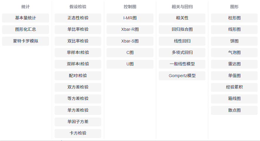 在ZenDAS中,分析方法一共分为五类分别是:图形、相关与回归、控制图、假设检验和统计。