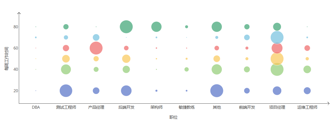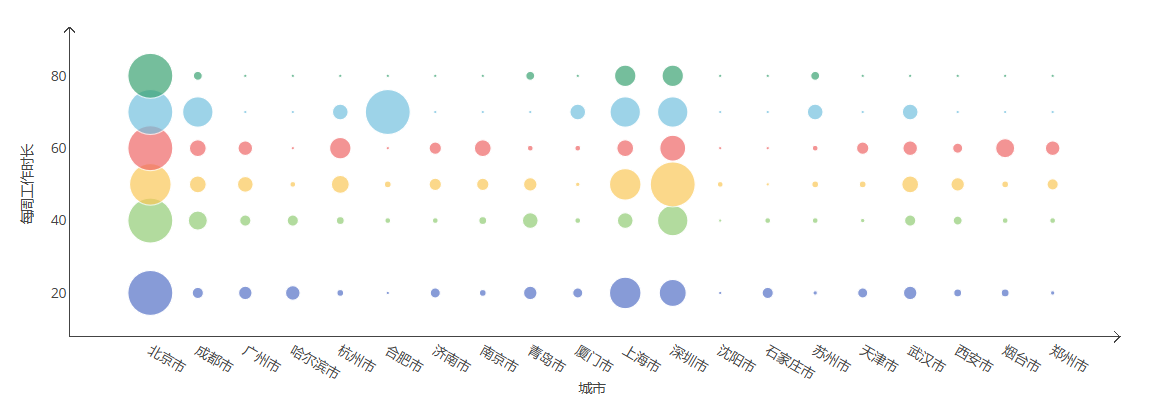气泡图用不同大小的圆点表示不同类别的数据,同时展示了三个变量之间的关系。