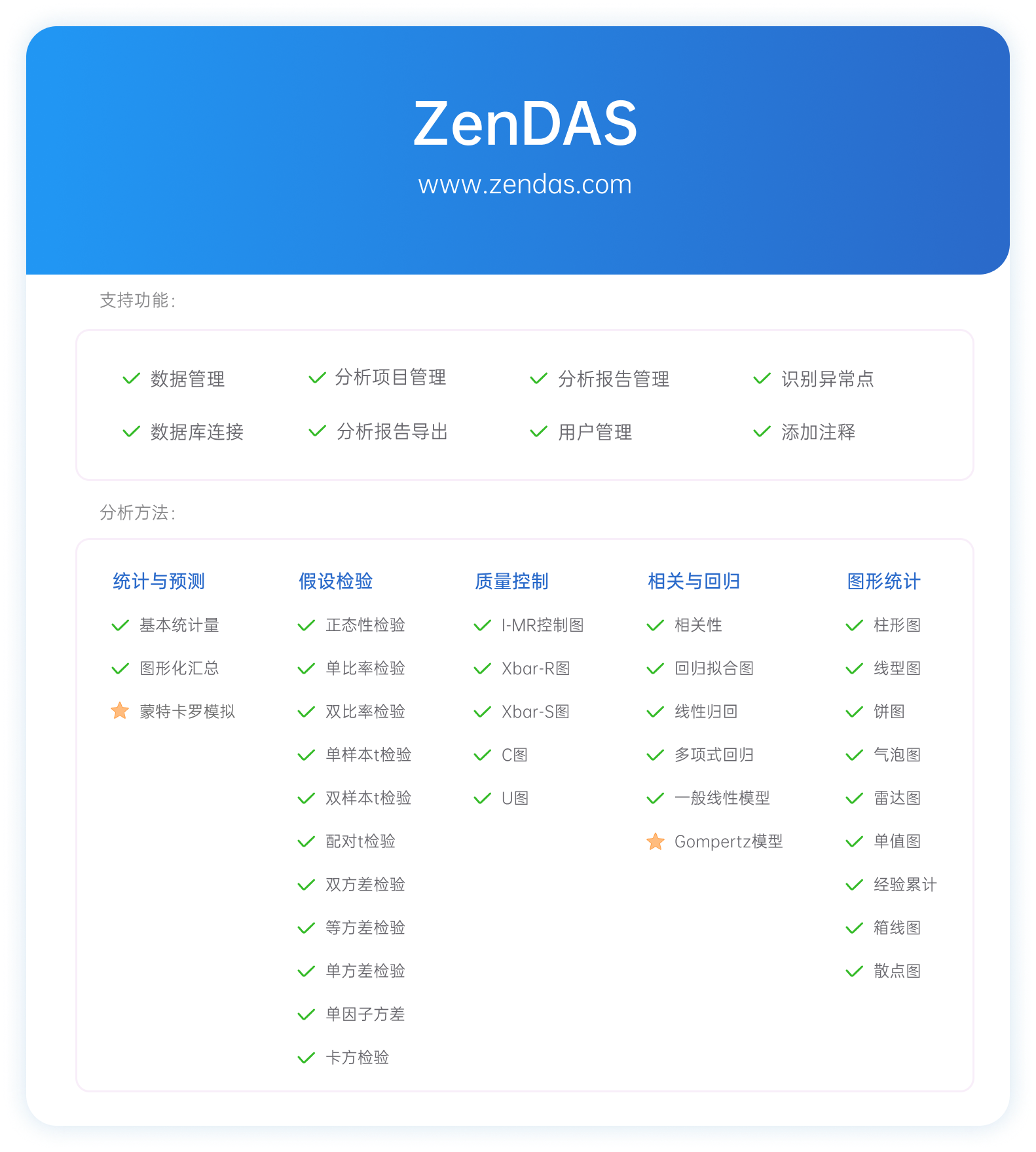 ZenDAS是一款专注于数据统计分析与管理的国产软件,支持数据管理、分析 项目管理、分析报告导出与管理、用户权限控制等功能,涵盖 图形统计、相关与回归、控制图、假设检验、蒙特卡罗模拟、Gompertz模型等丰富分析方法。凭借 灵活的项目化管理、精细的权限控制、强大的分析能力,ZenDAS已成功帮助多家企业实现数据驱动决策,提升研发效能与管理水平。